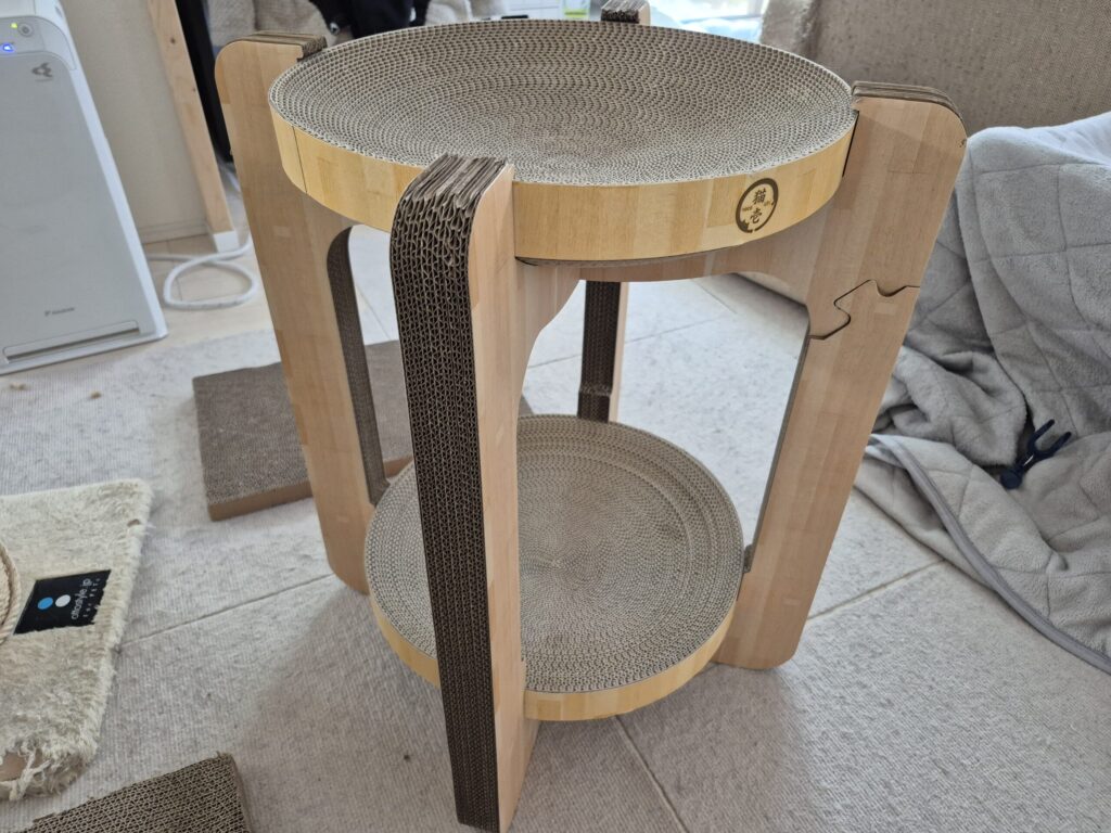 バリバリタワーは木目調のプリント(ダンボールですが)が施されていて、非常にシンプル。 「いかにも猫グッズ!」という主張が強すぎず、リビングのインテリアを邪魔しないのがパパ的にも高ポイントです。